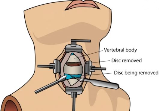 دیسککتومی و فیوژن قدامی گردنی : در این روش جراح برش کوچکی را در قسمت جلویی گردن ایجاد میکند. بعد از آن عضلات، رگهای خونی و اعصاب کنار گذاشته میشود تا بافت استخوانی ستون فقرات و دیسکهای بین مهرهای نمایان شود.